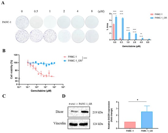 Cell growth was observed after one week of gemcitabine treatment through a colony formation assay. The results showed that the colony area of PANC-1 GR cells was significantly more extensive than that of PANC-1 cells (p < 0.0001) (Figure 2A). Furthermore, cell viability analysis showed that after 72 h of gemcitabine treatment, the survival rate of PANC-1 GR cells was significantly higher than that of PANC-1 cells (p < 0.0001) (Figure 2B). These results indicate that this experiment’s PANC-1 GR cell line exhibits gemcitabine resistance. Subsequent qRT-PCR and Western Blot analyses revealed that the expression level of Dicer in the gemcitabine-resistant PANC-1 GR cell line was significantly higher than that in PANC-1 cells (p < 0.05) (Figure 2C,D). Therefore, these results suggest a positive correlation between Dicer expression levels and gemcitabine resistance.