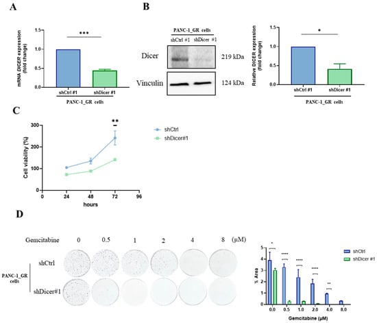 To further investigate whether Dicer expression affects the development of gemcitabine resistance in pancreatic cancer cells, we established PANC-1 GR cells with silenced Dicer using lentiviral infection. We confirmed the silencing effect through qRT-PCR and Western Blot (Figure 3A,B). Additionally, cell viability assays comparing the growth characteristics of the two cell lines showed that at 72 h, the growth rate of PANC-1 GR/shDicer was significantly lower than that of PANC-1 GR/shCtrl (p < 0.01), with a similar trend at 24 and 48 h (Figure 3C). Moreover, as the dose of gemcitabine increased, the colony area of PANC-1 GR/shDicer cells was significantly smaller than that of PANC-1 GR/shCtrl, indicating a significant increase in drug sensitivity to gemcitabine in PANC-1 GR/shDicer cells (p < 0.0001) (Figure 3D). This demonstrates that high expression of Dicer enhances gemcitabine resistance in pancreatic cancer cells and increases the cell proliferation rate.