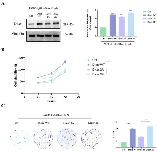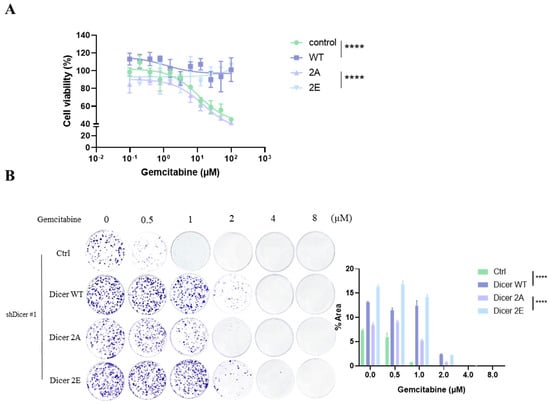 Next, we observed the cell growth rate after gemcitabine treatment. At 24, 48, and 72 h, the growth rates of Dicer WT and Dicer 2E were significantly higher than those of the control and Dicer 2A (p < 0.0001) (Figure 4B). Furthermore, the colony formation assay revealed that Dicer WT and Dicer 2E significantly restored the ability to form colonies compared to the control group. At the same time, Dicer 2A continued to inhibit cell growth (p < 0.0001) (Figure 4C). These results demonstrate that phosphorylation at Dicer S1728E/S1852E can increase the rate of cell proliferation.