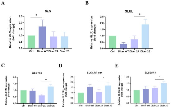 Previous studies have shown that the development of gemcitabine resistance in pancreatic cancer cells is closely related to abnormal cancer cell metabolism. Furthermore, based on our past research, phosphomimetic Dicer phosphorylation at another site (S1016E) affected glutamine metabolism in pancreatic cancer cells, leading to gemcitabine resistance. Therefore, we examined the change in metabolism-related genes. The results of qPCR showed that the expression of GLUL was significantly increased in Dicer 2E (p < 0.05), while there were no changes in GLS and GLUL expression in the control group and Dicer 2A (Figure 6A,B). Additionally, observing changes in the expression of transport proteins involved in glutamine metabolism, compared to Dicer 2A, Dicer 2E had significantly higher expressions of SLC1A5 (p < 0.01) (Figure 6C), SLC38A1 (p < 0.05) (Figure 6D), and SLC1A5_var (p < 0.05) (Figure 6E).