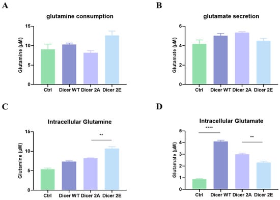 Moreover, using the glutamine/glutamate-Glo assay kit to detect the cells’ ability to uptake glutamine from the medium and release glutamate, the results showed that Dicer 2E had a higher capacity to uptake glutamine and a trend of releasing less glutamate into the extracellular environment (Figure 7A,B). On the other hand, the intracellular glutamine concentration in Dicer 2E was significantly higher than in Dicer 2A (p < 0.01) (Figure 7C). In comparison, the intracellular glutamate concentration was considerably lower than in Dicer 2A (p < 0.01) (Figure 7D). These results correspond with the significant increases in GLUL expression and the expression of glutamine metabolism transport proteins in Dicer 2E, indicating that phosphorylation at Dicer S1728E/S1852E significantly increases GLUL expression and the expression of glutamine metabolism transport proteins, further increasing the intracellular glutamine concentration and accumulating within the cells.