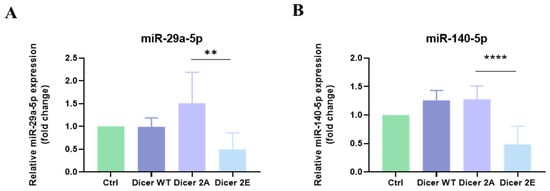 Referring to previous studies and using TargetScan (http://www.targetscan.org/vert_72/, accessed on 20 August 2024) software analysis, miR-29a-5p and miR-140-5p can bind to glutamine synthetase (GLUL) and regulate mRNA and protein expression [11]. To understand how phosphorylation at Dicer S1728E/S1852E regulates GLUL, we designed primers for miR-29a-5p and miR-140-5p and used qPCR to detect changes in these miRNAs. The results showed that the expression levels of miR-29a-5p and miR-140-5p in Dicer 2E were significantly lower than in Dicer 2A (p < 0.01) (Figure 8A,B). This confirms that the expression of GLUL is increased substantially in Dicer 2E (Figure 8A,B), demonstrating that phosphorylation at Dicer S1728E/S1852E affects the expression of glutamine synthetase in pancreatic cancer cells through the regulation of miR-29a-5p and miR-140-5p, thereby influencing glutamine metabolism balance and further increasing intracellular glutamine concentration.