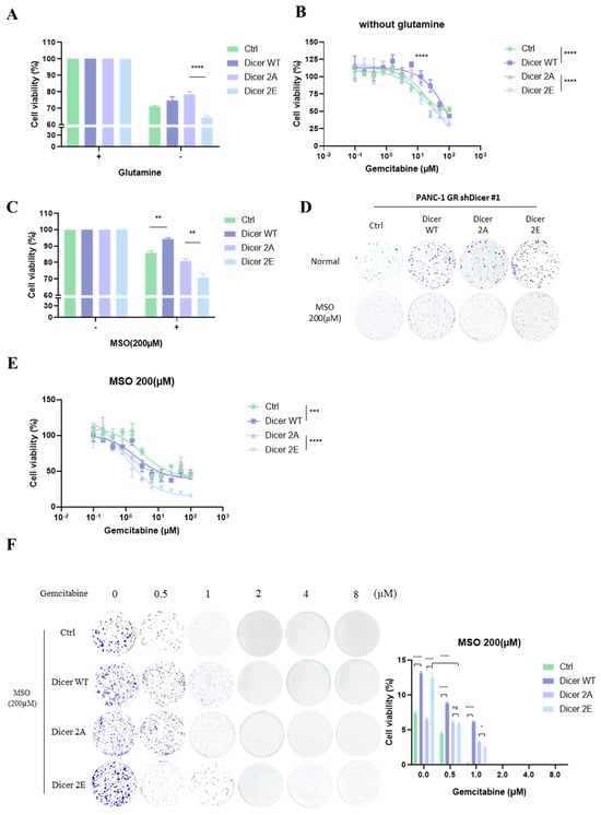 To confirm that phosphorylation of Dicer at S1728E/S1852E leads to the development of gemcitabine resistance and affects cancer cell proliferation by altering glutamine metabolism balance, we cultured the cells in a glutamine-deficient medium. We used cell viability assays and colony formation assays to determine whether glutamine deficiency can slow down the growth of pancreatic cancer cells and increase their sensitivity to gemcitabine. The results showed that consistent with the qPCR results, Dicer 2E, which had the highest intracellular glutamine concentration, exhibited significantly reduced cell proliferation under glutamine-deficient conditions (p < 0.0001) and significantly increased sensitivity to gemcitabine (p < 0.0001) compared to Dicer 2A (Figure 9A,B).