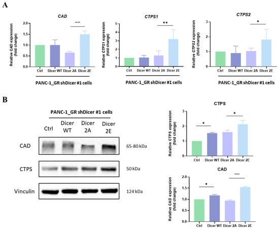 Simulating phosphorylation of Dicer at S1728E/S1852E increases the expression of enzymes CAD and CTPS1 and 2 required for pyrimidine synthesis, leading to competitive inhibition by gemcitabine’s end metabolites and resulting in gemcitabine resistance. (A) The mRNA expression levels of CAD and CTPS1 and 2 in Ctrl, Dicer WT, Dicer 2A, and Dicer 2E cells were tested using qRT-PCR. The qRT-PCR data were normalized to the GAPGH level in each sample, and a bar plot presents fold changes in the expression of PANC-1_GR_shCtrl#1 cells. (B) The protein expression levels of CAD and CTPS1 and 2 in Ctrl, Dicer WT, Dicer 2A, and Dicer 2E cells were tested using Western Blot, with Vinculin as the control. Data are presented as mean ± SEM and analyzed using One-way ANOVA. Significant differences are indicated when p < 0.05 (represented as * p < 0.05, ** p < 0.01, and **** p < 0.0001).