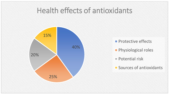 This pie chart illustrates the multifaceted health effects of antioxidants, highlighting their protective roles in preventing aging, inflammation, and cancer. Understanding these dynamics is crucial for informed health decisions regarding antioxidant consumption. In detail: Protective effects: Prevents aging, reduces inflammation, lowers cancer risk. Physiological roles: Supports sperm maturation, aids in embryogenesis, enhances immune response. Potential risk: Disrupts redox equilibrium and may lead to reductive stress. Sources of antioxidants: Endogenous (produced by the body) and exogenous (vitamins from diet).