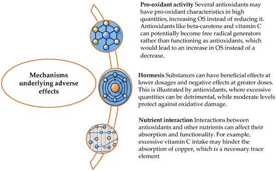 The effects of antioxidants on fertility are complex. While moderate antioxidant intake can reduce oxidative damage to sperm DNA and improve sperm quality in men, excessive supplementation may have the opposite effect. On the other hand, excessive supplementation of antioxidants can disrupt the delicate balance of ROS necessary for optimal sperm function, potentially lowering sperm motility and viability. ROS-induced sperm destruction accounts for 30% to 80% of male infertility cases. Moreover, specific antioxidants can adversely affect fertility in both men and women when consumed excessively [50]. Evidence indicates that excessive intake of antioxidants such as vitamins C and E may impair sperm motility and quality in men, leading to decreased fertility. Overconsumption of antioxidants may negatively impact female fertility by disrupting the delicate hormonal balance required for normal menstruation and ovulation.