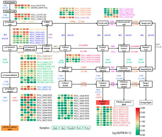 A homology-based approach identified 188 lignin biosynthesis-related genes from the 40,639 filtered genes (Figure S2). From these, 70 genes with FPKM values exceeding 10 were selected, including 2 PAL genes, 3 C4H genes, 1 C3H gene, 6 4CL genes, 2 HCT genes, 1 CSE gene, 10 CCR genes, 2 CAD genes, 4 COMT genes, 4 CCoAOMT genes, 5 F5H genes, 21 POX genes, and 9 LAC genes (Figure 1). A heatmap analysis indicated that several of these 70 genes were highly expressed in the bark, root, and twig, while exhibiting low expression in needles, suggesting their potential role as key lignin biosynthesis genes. Notable examples include PITA_41378 (C4H), PITA_28257 (C3H), PITA_31897 (COMT), PITA_44880 (CCoAOMT), PITA_20438 (POX), PITA_30025 (POX), and PITA_21162 (LAC) (Figure 1).