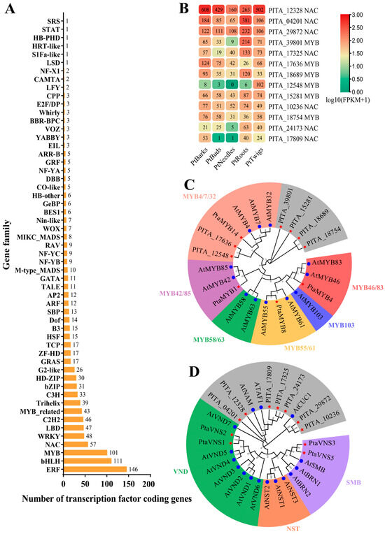 TFs are critical regulators of SCW formation. From the 40,639 detected genes, we identified 1047 TF-encoding genes, with the ERF family being the most abundant, followed by the bHLH, MYB, NAC, and WRKY families. Previous studies have highlighted the roles of PtaMYB1 (PITA_47805), PtaMYB4 (PITA_05699), PtaMYB8 (PITA_06912), PtaMYB14 (PITA_48233), PtaVNS1 (PITA_19394), PtaVNS2 (PITA_33113), PtaVNS3 (PITA_06801), and PtaVNS5 (PITA_38627) in SCW formation in loblolly pine [37,38,39,40]. However, RNA-seq data indicated low expression levels of these eight genes in the bark, root, and twig samples (Figure S4). Specifically, PtaVNS1 (PITA_19394) and PtaVNS2 (PITA_33113) were excluded due to very low expression (FPKM < 1) (Figure S4). Interestingly, seven NAC and six MYB genes showed high expression levels in the bark, root, and twig samples (Figure 5B).