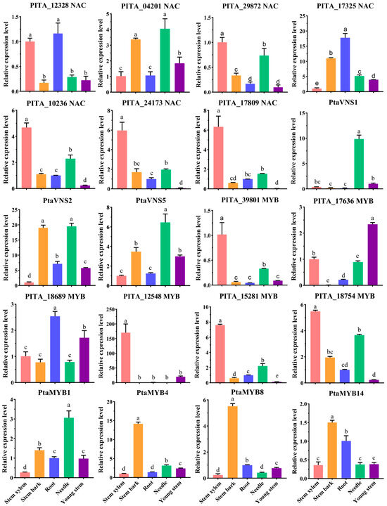Figure 6. RT-qPCR analysis of MYB and NAC genes in the five tissues. The salmon, orange, royal blue, spring green, and purple bars represent the relative expression levels of genes in the stem xylem, stem bark, root, needle, and young stem (unlignified), respectively. The error bars represent the SDs from three replicates. The Duncan test was used to determine the significance of gene expression differences between the different tissues. The different lowercase letters indicate significant differences in the gene expression levels between the different tissues (p < 0.05).