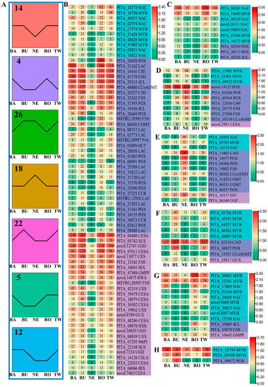 Figure 7. STEM analysis of the filtered genes. BA, barks; BU, buds; NE, needles; RO, roots; TW, twigs. (A) Seven significantly clustered profiles. (BH) The heatmaps of NAC, MYB, lignin biosynthesis-related genes, and cellulose, and hemicellulose biosynthesis-related genes in Profile 14, Profile 4, Profile 26, Profile 18, Profile 22, Profile 5, and Profile 12, respectively. The log10(FPKM+1) values of genes were used to generate the heatmaps of gene expression levels. The numerical values in the heatmaps represent the FPKM values of genes. Only the genes with FPKM values greater than 10 are displayed in the figure.