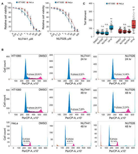 DNA-PK inhibition induces cell cycle arrest and cell death without DSBs. (A) Dose–response curves after treatment for HT1080 and HeLa cells with NU7441 or NU7026 at increasing concentrations for 4 days. Data are presented as mean ± SD (n = 3 biologically independent experiments); (B) analysis of cell cycle distribution of control HT1080 cells and cells treated with NU7441 (20 μM, 24–48 h) or NU7026 (50 μM, 24–48 h); (C) HT1080 and HeLa cells were treated with either DMSO, NU7441 (20 μM, 24 h), NU7026 (50 μM, 24 h), or DNA topoisomerase II inhibitor etoposide (VP16; 10 μg/mL, 1 h). A neutral comet assay was performed; the box plots show the tail moment. Horizontal lines represent the median. **, p < 0.01 by unpaired t test; n.s., not significant (n > 500).
