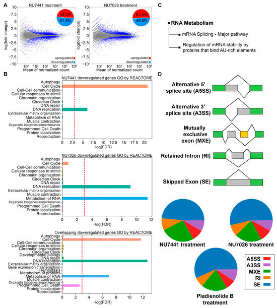 The involvement of DNA-PK in the regulation of the cell cycle and DNA replication has been well documented in previous studies. However, the role of DNA-PK in RNA metabolism is underexplored, prompting us to focus more closely on this group of genes. For the genes downregulated by both NU7441 and NU7026, we constructed a hierarchical clustering tree to find correlations between significant pathways (Figure 2C). We identified two main branches, including one with genes associated with mRNA splicing (e.g., DDX46, HNRNPR, USP39, SART1, DHX15, SRSF3, KHSRP, SNRPA1, SNRPE, SF3B3, DHX8, DHX9, DDX23, and SNU13, among others), and another with genes associated with the regulation of mRNA stability (e.g., PARN, ELAVL1, EXOSC7, EXOSC5, and HNRNPD, among others). The observation that gene sets associated with splicing regulation were affected by DNA-PK inhibition suggests that splicing activity is impaired in cells with reduced DNA-PK activity. To test this hypothesis, we treated cells with NU7441 or NU7026 and assessed global changes in splicing upon DNA-PK inhibition (Figure 2D). We identified 249,781 alternative splicing events induced by NU7026, 15,671 of which were statistically significant (FDR ≤ 0.05, delta percent-spliced-in [dPsi] ≥ 0.05), and 231,379 alternative splicing events caused by NU7441, 9987 of which were statistically significant (FDR ≤ 0.05, dPsi ≥ 0.05). This result equates to splicing alterations in 4542 and 5765 genes upon treatment with NU7441 and NU7026, respectively. Exon skipping was the most commonly observed alteration (Figure 2D). Interestingly, the splicing changes induced by NU7441 and NU7026 were similar to those caused by pladienolide B, an inhibitor of the SF3B1 subunit of the spliceosome, which induced 25,239 statistically significant alternative splicing events (FDR ≤ 0.05, dPsi ≥ 0.05) out of 337,202 identified (Figure 2D).