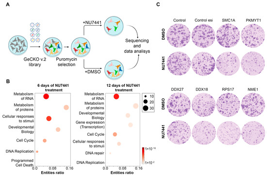 For the CRISPR screen, the human knockout pooled library GeCKO V2 (Addgene, #1000000048) was used. This library comprises 123,411 single-guide RNAs (sgRNAs) that target 19,050 genes. GeCKO V2 gRNAs were amplified and packaged into lentiviruses using the HEK293T cell line and concentrated to increase viral titer. In total, 170 millions of HT1080 cells were infected at a multiplicity of infection (MOI) of 0.3 to obtain a 400x coverage and were selected during 3 days at 1 μg/mL of Puromycin (Sigma, P7255). Next 20 × 106 cells were treated with dimethyl sulfoxide (DMSO, Sigma, #472301), and 20 × 106 cells were treated with 2.5 μM of NU7441. Cells were collected for DNA extraction at day 0 (T0), day 6 (T6), and day 12 (T12). Frozen cell pellets were thawed, and genomic DNA was extracted with a Quick-DNA Midiprep Plus Kit (Zymo Research, Irvine, CA, USA; D4075) according to the manufacturer’s protocol. Polymerase chain reaction (PCR) was performed according to the instructions in the original paper [22].