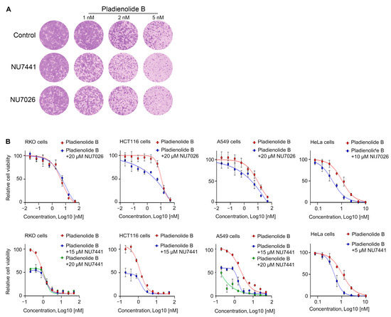 Finally, we decided to check whether the cytotoxicity of DNA-PKi could be enhanced by combining them with splicing inhibitors. To do this, we pretreated HT1080 cells with pladienolide B, an inhibitor of the splicing factor SF3b, and then additionally incubated the cells with NU7441 or NU7026. Using a clonogenic assay, we confirmed that compromising mRNA splicing via pladienolide B (SF3b inhibitor) treatment also significantly increased HT1080 cell sensitivity to NU7441 or NU7026 (Figure 5A). Lastly, we sought to evaluate the effects of combining splicing inhibitors with DNA-PKi in additional tumor-specific cell lines. For these experiments, we employed the A549 human alveolar carcinoma cell line, HeLa human cervical carcinoma cell line, and HCT116 and RKO human colorectal carcinoma cell lines. Our results demonstrate that treatment with NU7441 significantly potentiated the cytotoxic effects of pladienolide B in A549 and HeLa cells, with a comparatively moderate effect observed in HCT116 cells (Figure 5B). Likewise, NU7026 enhanced the cytotoxicity of pladienolide B in A549, HeLa, and HCT116 cell lines; however, neither NU7441 nor NU7026 exhibited any enhancement of cytotoxic effects of pladienolide B in RKO cells (Figure 5B).