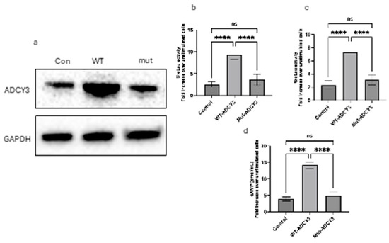 Impact of wild-type and mutant ADCY3 on protein expression, signaling pathways, and cAMP production in 3T3-L1 cells. (a) Western blot showing ADCY3 protein levels in 3T3-L1 cells transfected with wild-type (WT) or mutant ADCY3. GAPDH was used as a loading control. (b) CRE-luciferase activity in 3T3-L1 cells expressing WT or mutant ADCY3. Cells were treated with forskolin, resulting in a 2.5-fold increase in CRE-luciferase activity in WT ADCY3-expressing cells compared to unstimulated controls, while mutant ADCY3 showed significantly reduced activity (Control: 2.5 ± 0.61; WT-ADCY3: 9.33 ± 1.11; Mut-ADCY3: 3.62 ± 1.27; n = 3). (c) SRE-luciferase activity in 3T3-L1 cells expressing WT or mutant ADCY3. Forskolin treatment led to a nearly 3-fold increase in SRE-luciferase activity in WT ADCY3-expressing cells, whereas mutant ADCY3 showed markedly lower activity (Control: 2.32 ± 0.65; WT-ADCY3: 7.28 ± 1.13; Mut-ADCY3: 3.1 ± 0.76, n = 3). (d) Intracellular cAMP levels in 3T3-L1 cells expressing WT or mutant ADCY3 following forskolin treatment. WT ADCY3 significantly increased cAMP levels, while mutant ADCY3 exhibited only a modest increase (Control: 3.89 ± 0.63; WT-ADCY3: 14.10 ± 1.01; Mut-ADCY3: 4.84 ± 1.22, n = 3). Error bars represent the standard deviation (SD) from three independent experiments. **** p < 0.0001. Note: ns: not significant.