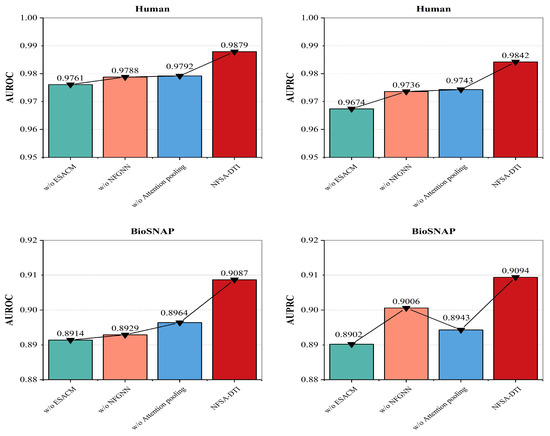 In order to verify the influence of each innovation module in NFSA-DTI on the model’s performance, we designed several model variants to conduct ablation experiments. The results are shown in Figure 1.