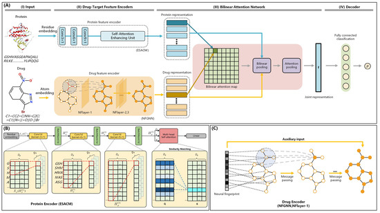 Recently, significant advancements in drug–target interaction prediction have been achieved due to rapid progress in deep learning (DL)-based approaches [7,8,9,10]. Many of these approaches seamlessly integrate the drug chemical space, protein sequence, and interaction information into a comprehensive end-to-end framework [11,12]. They approach DTI prediction as a binary classification task and utilize various deep encoding and decoding modules, such as graph neural networks [13,14,15], deep neural networks [16,17], or transformer architectures [18,19], to make predictions. With the advancements in deep learning techniques, these models can automatically learn data-driven representations of drugs and proteins from extensive DTI data instead of solely relying on predefined descriptors.