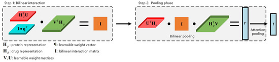 We employ the bilinear attention network proposed by Bai et al. [14] and improve its subsequent pooling operation. Specifically, we replace the summation pooling with an attention pooling. The sum pooling method is relatively straightforward to implement and incurs a low computational cost. However, it lacks the ability to retain the intensity information of features, potentially compromising learning performance. To address this limitation and enhance the model’s capacity in capturing important information between drug substructures and target substructures, we employ an attention pooling approach inspired by Er et al.’s [52] investigation on the importance of sentence components. The attention pooling assigns weights based on the significance of each element in the input matrix, generating an enhanced pooled representation. The enhanced pooled representation promotes the model’s learning of the drug–target interaction modeling process, thereby improving the overall interpretability of the model. The overall flowchart of the improved bilinear attention network is shown in Figure 5.