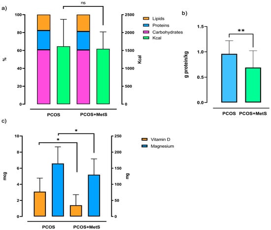 Nutrient intake comparison between PCOS and PCOS + MetS groups. (a) Percentage of macronutrient distribution in both group’s diet vs total caloric consumption, (b) protein intake by weight in kilograms, and (c) micronutrient intake of vitamin D (mcg) and magnesium (mg). Mann–Whitney U Test with median and interquartile range, * p < 0.05; ** p < 0.01; ns: not significant. PCOS: polycystic ovary syndrome, PCOS + MetS: polycystic ovary syndrome + metabolic syndrome, mcg: microgram, mg: milligram.