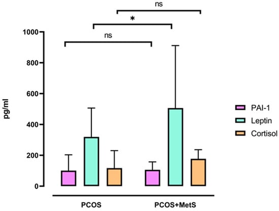 Metabolic profile evaluation of women with PCOS and PCOS + MetS. Serum levels of PAI-1, leptin, and cortisol are shown. Mann–Whitney U Test with median and interquartile range. * p < 0.05; ns: not significant. PCOS: polycystic ovary syndrome, PCOS + MetS: polycystic ovary syndrome + metabolic syndrome.