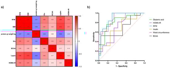 Non-parametric correlation analysis was performed to study the association between diet, body composition, and serum amino acids. The Spearman’s rank heatmap showed significant correlations from each profile analysis (Figure 3a). In the case of RFM and BMI, a negative correlation was identified with g/kg protein consumption (r = −0.47, p = 0.002; r = −0.48, p = 0.001, respectively) and a positive correlation with the levels of glutamic acid (r = 0.53, p ≤ 0.001; r = 0.47, p = 0.0018), BCAAs (r = 0.33, p = 0.035; r = 0.32, p = 0.045), leptin (r = 0.69, p ≤ 0.001; r = 0.73, p ≤ 0.001), and HOMA-IR (r = 0.52, p = 0.008; r = 0.51, p = 0.008). Interestingly, g/kg protein consumption was negatively correlated with the levels of leptin (r = −0.52, p = 0.001) and glutamic acid (r = −0.44, p = 0.004).