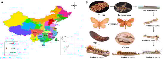 Introduction of D. kikuchii. (A) Distribution of D. kikuchii in China. (B) Life history of D. kikuchii [].