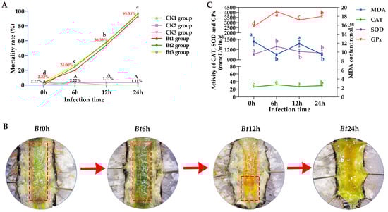 Toxic effects of Bt on the 5th instar larvae of D. kikuchii. (A) After eating pine needles soaked in PBS/Bt bacterial solution, the mortality rate of the 5th instar larvae of D. kikuchii was changed at CK, Bt0h, Bt6h, Bt12h and Bt24h. The mean value of the three biological repeated mortality rates of each comparison group is marked in the figure. The red font is the mean value of the mortality rate of each Bt infection time group, and the black font is the mean value of the mortality rate of each time group of the CK group. There was no significant difference in mortality between different time periods in CK group, but there was a significant difference in mortality between different infection time periods in Bt group, and almost all the larvae died after 24 h of infection. In the figure, capital letters indicate the difference of the average mortality of three biological repeats in CK group at different infection time nodes, and all of them are A, indicating that there is no difference in the mortality of each infection time node in CK group; Whether there is a significant difference between the average mortality of three biological repetitions at each infection time node in Bt group is indicated by lowercase letters. In the figure, the average mortality of 24 h is the highest, marked as a, followed by 12 h, 6 h and 0 h, and marked as b, c and d in turn because there are significant differences between the two. (B) The changes of the midgut tissue of the 5th instar larvae of D. kikuchii after eating the pine needles soaked in PBS/Bt bacterial solution. In Bt0h, the midgut tissue structure of larvae was complete and light green. For Bt6h, it can be observed that the midgut tissue structure is still intact, but the color becomes dark green; in Bt12h, the color of the first two groups has changed significantly, from dark green to yellow, and the lower part of the midgut has been festered and liquefied. By 24 h after Bt infection, the midgut tissue structure of the larvae had completely lost its complete structure and was completely liquefied. (C) The 5th instar of D. kikuchii after Bt infection. The a, b, c and d in the figure indicate that there are differences between groups.