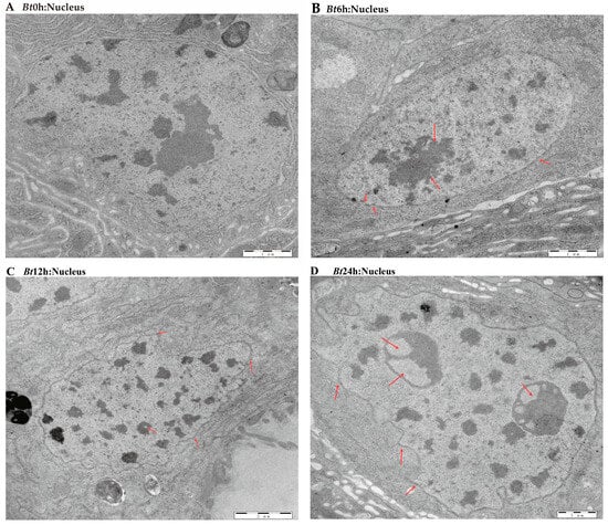 Pathological changes in cell nucleus in midgut tissue. (A) In the figure, the cell nucleus of the midgut tissue of the Bt0h group was full, the nuclear membrane structure was complete and smooth and the nucleoplasm was evenly distributed. (B) The red arrow in the figure indicates the nuclear membrane and nucleus of the lesion. Nucleolus aggregated, and the inner and outer membrane spaces of the nucleus were separated. (C) As shown by the red arrow, the nuclear lesion is aggravated, the nucleoli is hollow, the nuclear morphology is severely deformed, and the nuclear membrane is angular. (D) As shown by the red arrow, the nucleolus cavity becomes larger, the nucleus is seriously deformed and the nuclear membrane is obviously angular.