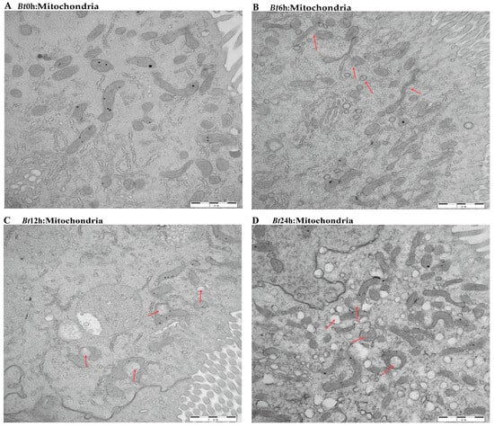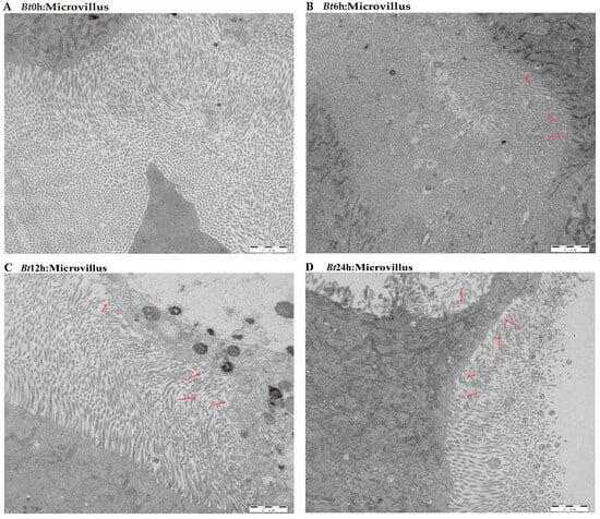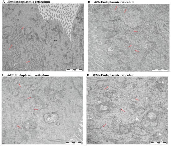 Pathological changes in endoplasmic reticulum in midgut tissue. (A) As shown by the red arrow, the endoplasmic reticulum in the Bt0h group was neatly arranged, with a large number and a complete structure. (B) As shown by the red arrow, the number of endoplasmic reticula decreased and the arrangement was disordered. (C,D) As shown by the red arrow, the endoplasmic reticulum is severely degraded, and only a very small number of undegraded endoplasmic reticula can be observed.