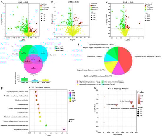 Analysis of different metabolites in midgut tissue. (A) Differential volcanic map of Bt6h vs. Bt0h formation. (B) Differential volcanic map of Bt12h vs. Bt0h formation. (C) Differential volcanic map of Bt24h vs. Bt0h formation. (D) Venn analysis of three groups of differential metabolites, with 27 intersecting differential metabolites obtained. The purple part is the intersection difference metabolite obtained. (E) Matching with the database of human metabolites, 27 different metabolites were classified. (F) KEGG enrichment analysis of 27 different metabolites showed that p < 0.05 was significant enrichment. (G) Based on the results of KEGG enrichment analysis, the topological analysis of the obtained signal pathways was carried out, among which the Nicotinate and nicotinamide signal pathways and the differential metabolite nicotinamide had the highest weight.