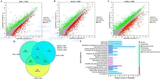 Total RNA was extracted from the midgut tissue samples of Bt0h, Bt6h, Bt12h and Bt24h groups by the Trizol method. After the quality and integrity of total RNA were tested, four cDNA libraries were established by using the MGIEasy RNA Library Preparation Kit (Shenzhen Huada Zhizao Technology Co., Ltd.) (No.21, Hong ’an Third Street, Yantian District, Shenzhen, China). The qualified library was sequenced by the DNBSEQ-T7 (formerly MGISEQ-T7) sequencing platform. The library construction and sequencing were completed by Wuhan Hope Group Biotechnology Co., Ltd. (No.8 Huacheng Avenue, Hongshan District, Wuhan City, China). The original sequencing data were filtered by the software fastp [] (https://github.com/OpenGene/fastp) (accessed on 30 October 2022). The clean data after quality control was compared with the reference genome of D. kikuchii (accession number: GCA_019925095.2) by the software HiSat2 [] (http://daehwankimlab.github.io/hisat2/) (accessed on 2 November 2022). RSEM [] (http://deweylab.github.io/RSEM/) (accessed on 5 November 2022) software was used to quantitatively analyze the expression levels of genes and transcripts, and the results of expression quantification were based on TPM. The homogenization process of TPM made the total expression in different samples consistent. DESeq2 software [] (https://bioconductor.org/packages/stats/bioc/DESeq2/) (accessed on 6 November 2022) was used to analyze the expression differences of the sample genes that met the screening conditions of p-adjust < 0.05 and |log2FC| ≥ 1, and the number of differentially expressed genes (DEGs) among the samples was counted. KEGG annotation of differentially expressed genes was performed by the KEGG database (https://www.genome.jp/kegg/) (accessed on 6 November 2022)), and KEGG pathway enrichment analysis was performed by KOBAS (http://kobas.cbi.pku.edu.cn/home.do) (accessed on 10 November 2022) software [].