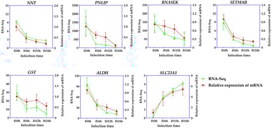 RT-qPCR verified the expression status of seven genes, and the relative mRNA expression of seven genes was consistent with the results of transcriptome sequencing. Compared with the Bt0h group, the expression levels of NNT, PNLIP, SETMAR, GST and ALDH decreased significantly at Bt6h, and then decreased gradually. SLC23A1 increased significantly at Bt6h, and the expression of SLC23A1 continued to increase with time. The results showed that the expression of the above seven genes was affected by Bt infection of D. kikuchii (Figure 9).