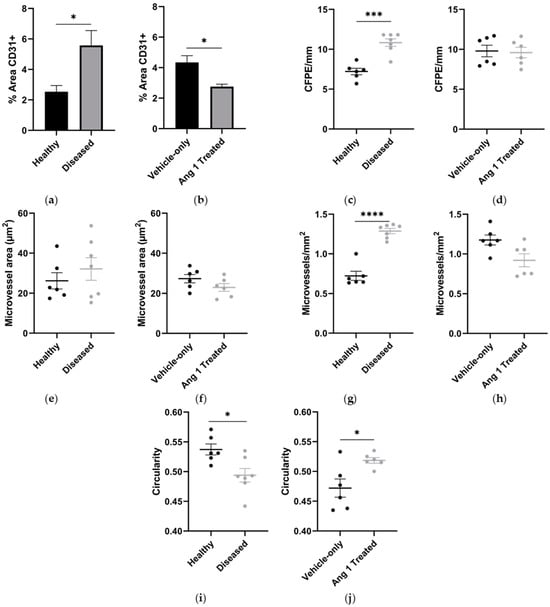Microvessel morphometry in Healthy, Diseased, Vehicle-only, and Ang 1-Treated gastrocnemius samples: (a,b) percent area CD31 positively stained tissue, (c,d) capillary-to-fibre perimeter exchange (CFPE) index, (e,f) microvessel area, (g,h) microvessel density, and (i,j) microvessel circularity. Data are mean ± SEM. n = 6–7. * p < 0.05, *** p < 0.001, **** p < 0.0001.