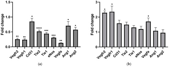 TaqMan Gene Expression Assays (Thermofisher, Waltham, MA, USA) was used to assay Cd31 (Pecam1 Mm01242576_m1), eNos (Nos3 Mm00435217_m1), Vegfr2 (Kdr Mm01222421_m1), Vegfr1 (Flt1 Mm00438980_m1), Vegf (Vegfa Mm00437306_m1), Ang 1 (Angpt1 Mm00456503_m1), Ang 2 (Angpt2 Mm00545822_m1), Tie1 (Tie1 Mm00441786_m1) Tie2 (Tek Mm00443243_m1), Csnk2a2 (Csnk2a2 Mm01243455_m1), Ap3d1 (Ap3d1 Mm00475961_m1), Actb (Actb Mm02619580_g1). RT-qPCR samples were produced and measured on the QuantStudioTM 5 system (Thermo Fisher Scientific, Waltham, MA, USA) with TaqMan Fast Advanced Master Mix (Applied Biosystems, Waltham, MA, USA). Quantification was performed using Design & Analysis Software 2.6 (Thermo Fisher Scientific, Waltham, MA, USA). Total Cd31, eNos, Vegfr1, Vegfr2, Vegf, Ang 1, Ang 2, Tie1, and Tie2 expression were normalized to the geometric mean of established control genes: Csnk2a2, Ap3d1, and Actb [27].