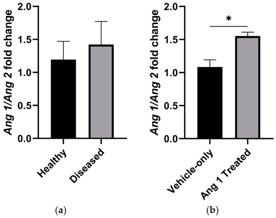 Ang 1:Ang 2 relative fold change ratio of (a) Healthy and Diseased and (b) Vehicle-only and Ang 1-Treated gastrocnemii. Data are mean ± SEM. n = 6. * p < 0.05.
