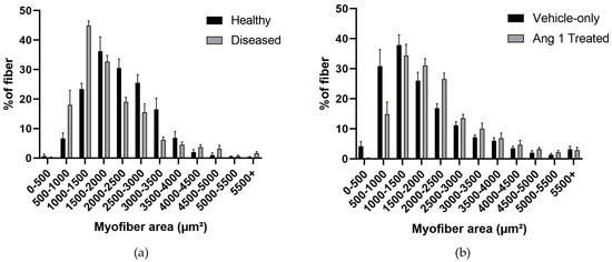 Distribution of myofiber area of (a) Healthy, Diseased p = 0.0642, (b) Vehicle-only, and Ang 1-Treated p = 0.0792 gastrocnemius samples. n = 6.