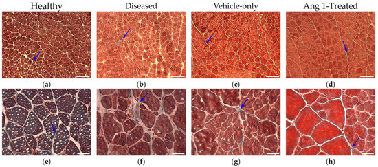 Representative histology of Masson’s Trichrome staining. Blue arrows indicate collagen deposition in (a) Healthy, (b) Diseased, (c) Vehicle-only, and (d) Ang 1-Treated gastrocnemius with scale bar = 150 μm. (e) Healthy, (f) Diseased, (g) Vehicle-only, and (h) Ang 1-Treated gastrocnemius with scale bar = 35 μm.