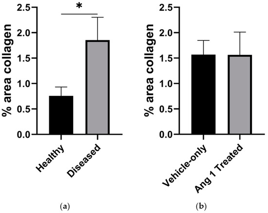 Diseased samples had 149.7 ± 36.3% more collagen than Healthy samples (p = 0.0260) (Figure 6a and Figure 7a). No significant differences were detected between Ang 1-treated and Vehicle-only samples (−0.637 ± 33.7%, p = 0.9847) (Figure 6b and Figure 7b).