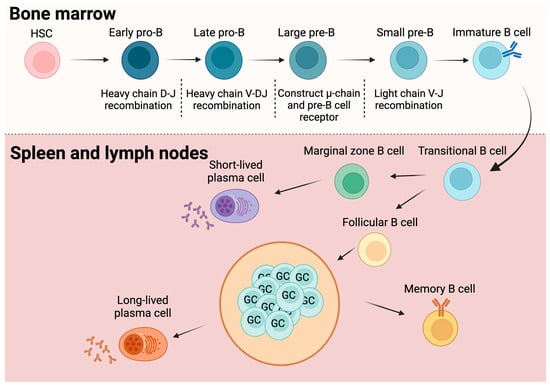 The development of B cells starts with undifferentiated hematopoietic stem cells (HSCs), which undergo a complex maturation process within the bone marrow (Figure 1). Early in their development within the bone marrow, B cells undergo immunoglobulin gene rearrangement to acquire functional antigen receptors []. B cell development begins with HSCs differentiating into common lymphoid progenitors (CLPs), followed by pro-B cell stages. During the early pro-B cell stage, heavy-chain DJ gene segments undergo recombination. Subsequently, the upstream V region joins the rearranged DJ segment in the late pro-B cell stage. The successful completion of this process forms a full μ heavy chain, leading to the pre-B cell stage. The recombination of the light-chain VJ gene segment marks the transition to the small pre-B cell phase, ultimately resulting in cells expressing surface immunoglobulin M (IgM) but not yet fully mature [,,]. To maintain self-tolerance, B cells undergo negative selection at this stage, eliminating self-reactive cells through mechanisms such as apoptosis, receptor editing, and clonal deletion [,,].