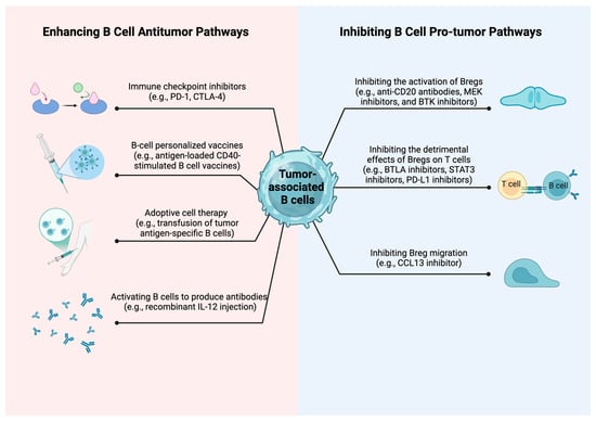 B cells in cancer therapy. In cancer treatment, strategies concerning B cells fall into two major categories: Firstly, enhancing B cell anti-tumor pathways, which comprises interrupting immune checkpoints, creating customized B cell vaccines, implementing adoptive B cell therapies, and augmenting B cells’ capability to produce antibodies; secondly, inhibiting B cell pro-tumor pathways, encompassing the suppression of Breg activation, curtailing the adverse effects of Bregs on T cells, and restraining Breg migration. Abbreviations: PD-1, programmed cell death protein 1; CTLA-4, cytotoxic T-lymphocyte-associated protein 4; IL-12, interleukin-12; MEK, mitogen-activated protein kinase; BTK, Bruton’s tyrosine kinase; BTLA, B and T lymphocyte attenuator; STAT3, signal transducer and activator of transcription 3; PD-L1, programmed cell death protein 1 ligand; CCL13, chemokine ligand 13. Created in BioRender. (accessed on 10 October 2024) https://BioRender.com/s13u901.