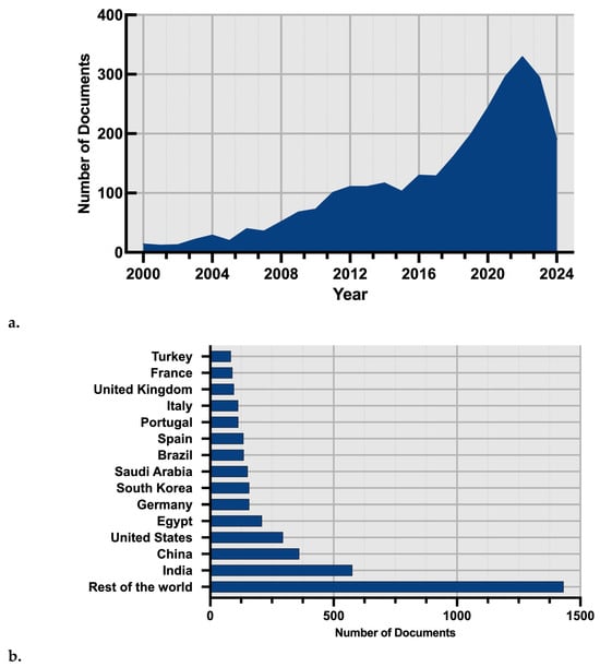Number of documents published by year (a) and country (b) according to relevant scientific publications. Specific keywords were used: (Algae OR Meta Cyano-bacteria) and (antimicrobial OR antibiotic OR bioactive) between 2000 and 2024.