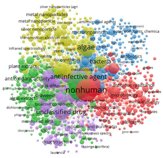 Map of Co-Occurrence of Terms in Algal Antimicrobials. according to relevant scientific publications with the specific keywords: (Algae OR Meta Cyano-bacteria) and (antimicrobial OR antibiotic OR bioactive) between 2000 and 2024.