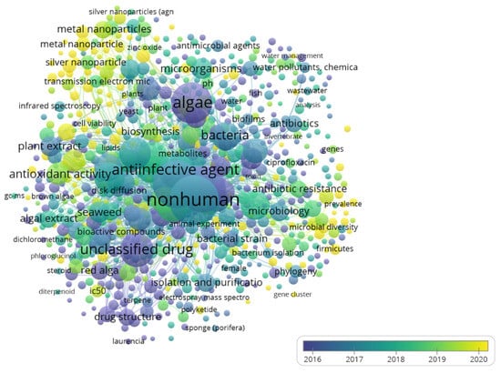 Co-occurrence map in terms of Algae-Derived Antimicrobial Research Products Over Time according to relevant scientific publications with the specific keywords: (Algae OR Meta Cyano-bacteria) and (antimicrobial OR antibiotic OR bioactive) between 2000 and 2024.