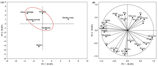 Diagram (biplot) of Principal Component Analysis (PCA) of undigested microgreens based on their total and individual bioactive compounds, antiglycation and antioxidant potential. (A) Grouping of samples, (B) grouping of analyzed parameters. TP = total phenolics, TFlo = total flavonols, TT = total tannins, THCA = total hydroxycinnamic acids, SS = soluble sugars, Glucosinol = total glucosinolates, ABTS = antioxidant capacity measured by the method ABTS, FRAP = antioxidant capacity measured by the FRAP method, DPPH = antioxidant capacity measured by the DPPH method, Antiglic = antiglication potential, Vit C = vitamin C, Fer = ferulic acid, Sin = sinapic acid, Q = quercetin, K = kaempferol, TIPA = total identified phenolic acids, TIF = total identified flavonoids, TIP = total identified phenolics, TIC = total identified compounds, fc = free compound, cc = conjugated compound.