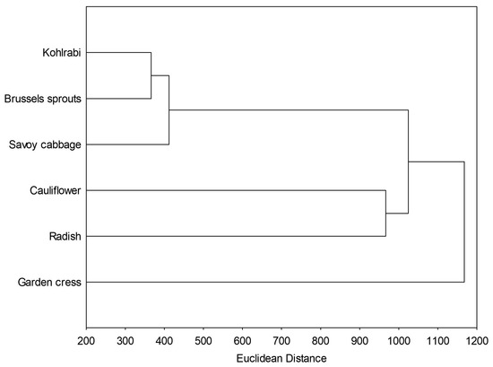 Hierarchical clustering is an unsupervised machine-learning algorithm used to group similar objects into clusters based on their distance or similarity. It provides a detailed view of relationships between data points, offering insight into data structure through dendrograms. Figure 5 shows the relationships between the microgreens before digestion based on their total and individual bioactive compounds, antioxidant and antiglycation potential. It is evident that kohlrabi, Brussels sprouts and Savoy cabbage formed two close clusters, while cauliflower was more distant and formed the cluster with radish from the genus Raphanus. This suggests that the phytochemical traits of cauliflower are not closely linked to its evolutionary and genetic factors. Garden cress was most distant from all the samples.