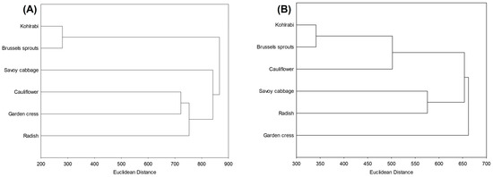 The hierarchical clustering of the samples after the initial and intestinal phases of digestion is shown in Figure 6. The most noticeable trend was that the Euclidean distance between the samples decreased progressively, the highest was between the original samples, 1200 (Figure 5), then after the initial phase was 900 (Figure 6A), and finally after the intestinal phase it was 700 (Figure 6B). The decreasing trend in Euclidean distance, indicating that the samples become more similar during digestion, suggests a homogenization of the measured parameters, that is phytochemicals’ concentration, antioxidant activity, and antidiabetic activity, as digestion progresses. Overall, this trend implies that although the raw samples differ in their phytochemical profiles and bioactivities, digestion processes may diminish these variations, producing a more uniform response in terms of antioxidant and antidiabetic activities. Both before and after digestion, the most similar microgreens, based on the measured phytochemicals, antioxidant and antidiabetic potential, were kohlrabi and Brussels sprouts.