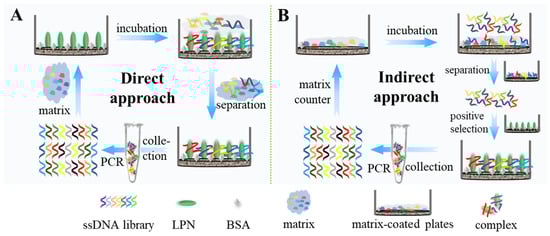 Schematic illustration of the direct (A) and indirect (B) matrix background SELEX approaches.