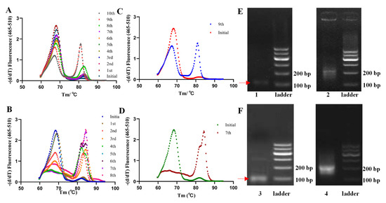 The dissociation curve analysis for each library to monitor the screening evolution: ten rounds (A) and the clear curves’ changes (C) in the direct approach; eight rounds (B) and the clear curves’ changes (D) in the indirect approach; their separate AGE results (E,F) of the PCR products after linking the connectors before HTS changed from 80 bp (bands 1 and 3) to the position of 200 bp (bands 2 and 4).