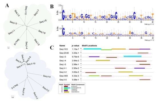 (A): Evolutionary tree of the top 10 sequences of the direct approach (top) and indirect approach (bottom) via MEGA-11. (B): Their sequence logos of conserved bases through a Clustal X analysis of the direct approach (Top) and indirect approach (bottom). (C): The motif analysis of the selected nine candidate sequences through MEME Suite.