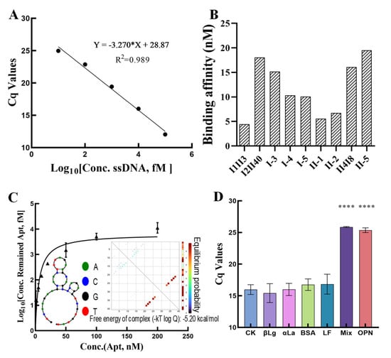 To verify the binding specificity of Seq.I1II3 for LPN (200 nM), a competition recognition assay in the LPN-coated microplate assay, which differs from the direct recognition assay in that Seq.I1II3 is first incubated with the protein before being added to the microplate, was performed. It was performed on other popular proteins in whey, including α-La and β-Lg, the coated BSA proteins, and LF, which can form complexes with LPN separately with a high concentration of 2 μM, and their protein mixtures. Figure 4D shows that the Cq values of LPN and Mix were higher than those of several other proteins (p < 0.0001) even with a tenfold difference in concentration. These results all indicated Seq.I1II3’s high specificity towards LPN and that these proteins and their mixtures do not affect the recognition of LPN by this aptamer.